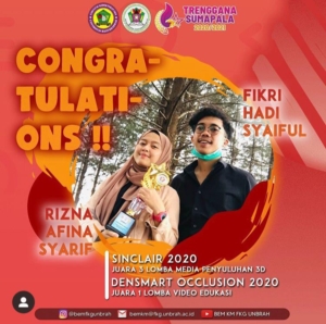 Kegiatan yang secara khusus diselenggarakan oleh Densmart Occlusion FKG Universitas Trisakti itu, video mahasiswa Unbrah yang berjudul “Awas Kena Corona” mengalahkan favorit juara dari FKG Universitas Indonesia dan FKG tuan rumah Universitas Trisakti.