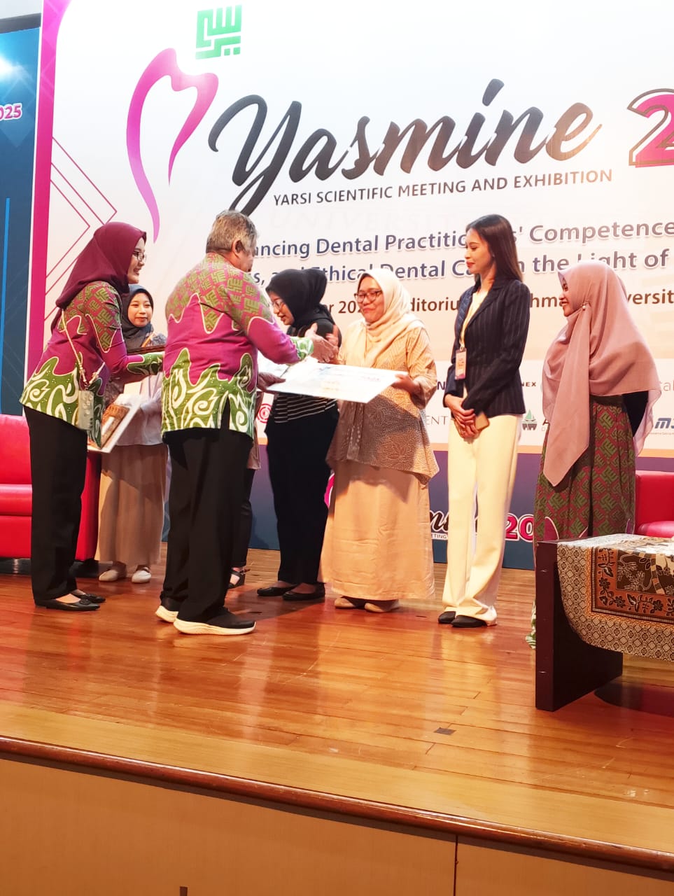 Penghargaan diserahkan langsung oleh Dekan FKG Universitas YARSI, Prof. Dr. drg. H. Bambang S. Trenggono, M.Biomed dan Ketua Komite YASMINE 2025, drg. Agus Ardinansyah, M.Pd.Ked.
