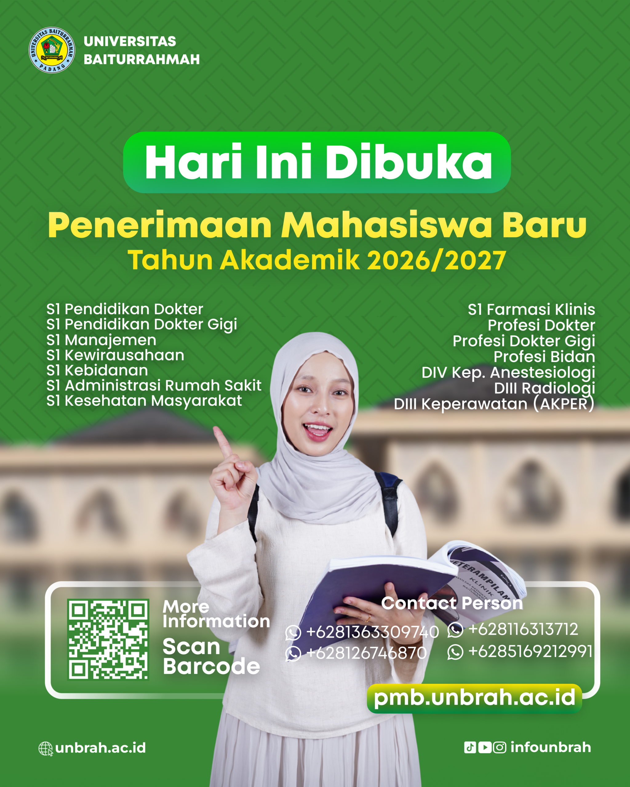 Universitas Baiturrahmah (Unbrah) resmi membuka Penerimaan Mahasiswa Baru (PMB) Tahun Akademik 2026/2027 mulai hari ini untuk Gelombang I. Calon mahasiswa dari seluruh Indonesia sudah dapat melakukan pendaftaran melalui laman resmi pmb.unbrah.ac.id.