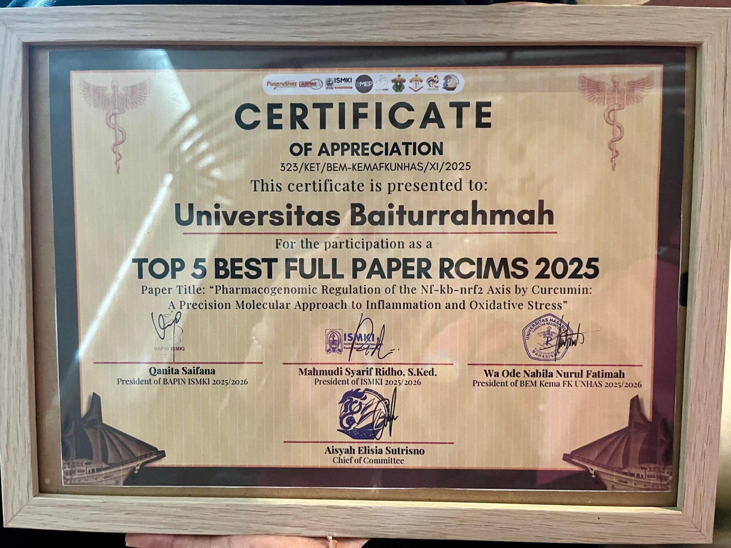 Mahasiswa Fakultas Kedokteran Universitas Baiturrahmah meraih prestasi di ajang RCIMS x IMO 2025 yang diselenggarakan pada 3-7 Desember 2025 di Universitas Hassanudin, Makasar, Sulawesi Selatan. Questa Soundri Alisya dan Nadiah Khairunnisa menyatu sebagai tim yang dibina oleh Apt. Dessy Abdullah, S.Si, M.Biomed, PhD.