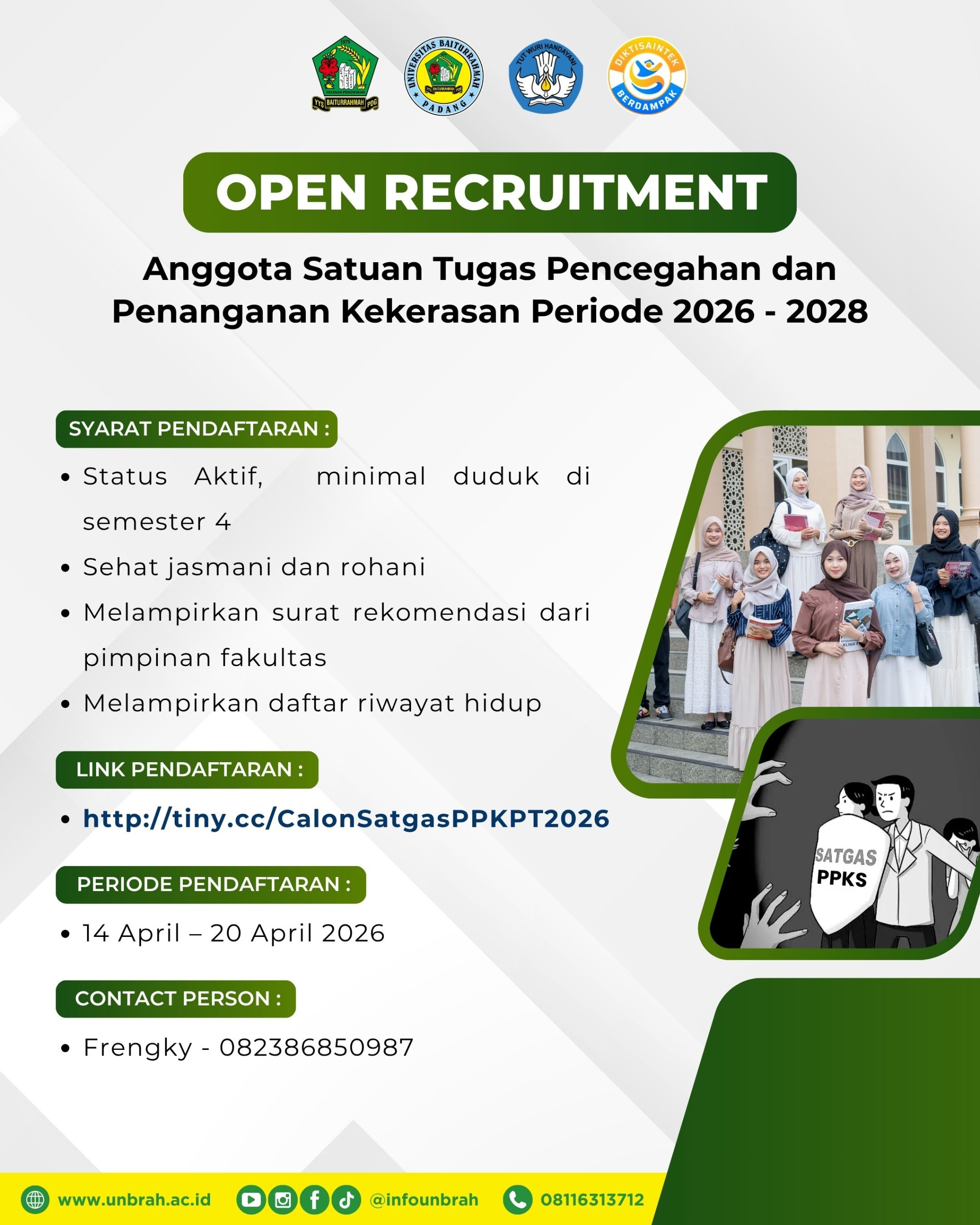 Universitas Baiturrahmah (Unbrah) secara resmi membuka pendaftaran bagi mahasiswa yang ingin bergabung menjadi Anggota Satuan Tugas Pencegahan dan Penanganan Kekerasan di Lingkungan Perguruan Tinggi (Satgas PPKPT) untuk masa bakti periode 2026-2028. Langkah ini diambil sebagai komitmen berkelanjutan universitas dalam menciptakan lingkungan kampus yang aman, inklusif, dan bebas dari segala bentuk kekerasan sesuai dengan regulasi yang berlaku.