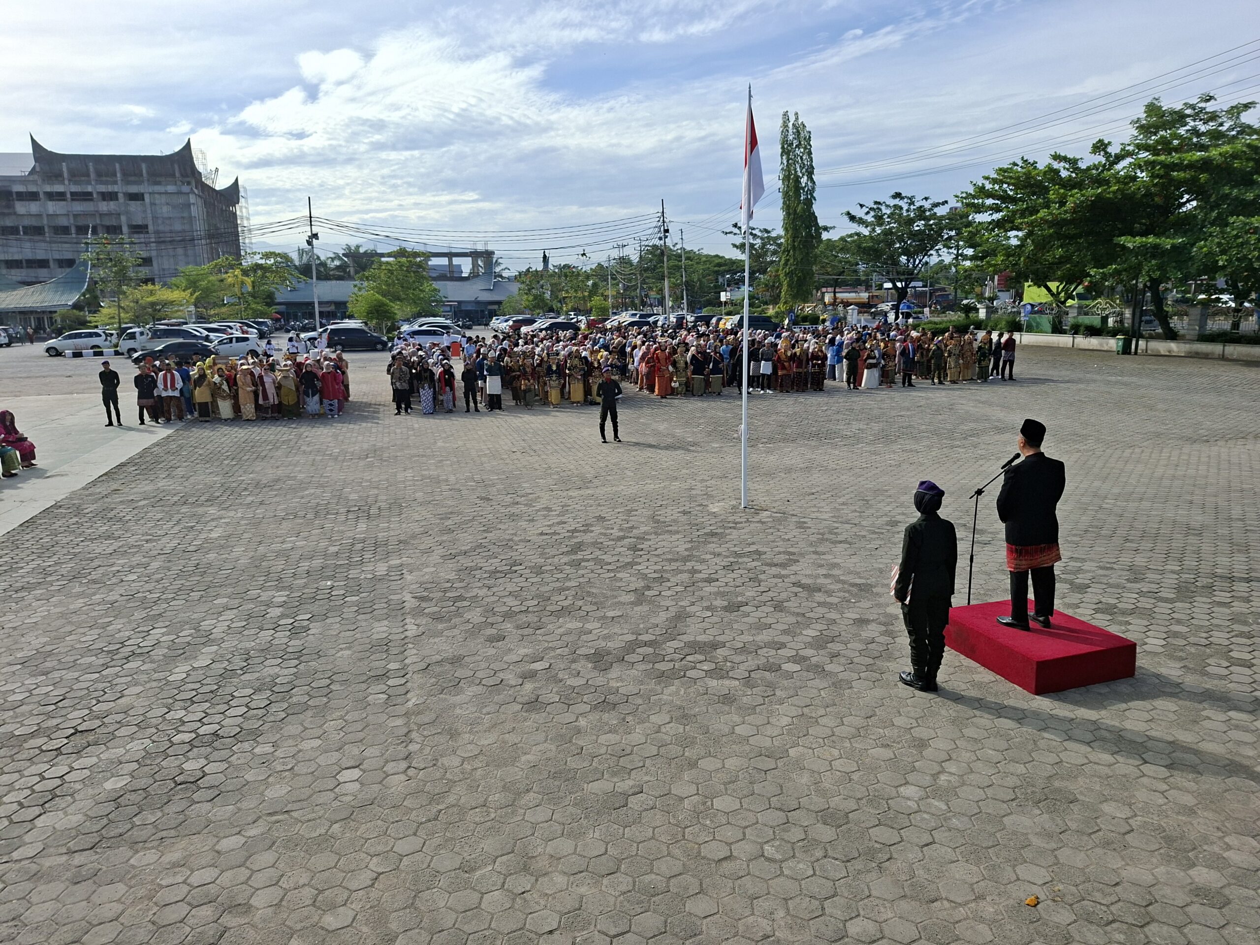 Mahasiswa yang menjadi peserta upacara mengenakan pakaian adat dari berbagai daerah nusantara, mencerminkan keberagaman Indonesia yang menjadi semangat dalam peringatan Sumpah Pemuda. Peserta berbaris dengan tertib sesuai fakultas masing-masing, menciptakan suasana upacara yang khidmat sekaligus penuh warna budaya.